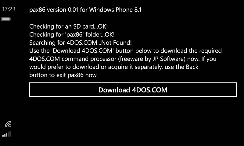 Similarly to what I did with my rpix86 and zerox86 emulators, I wanted the end user to have the option of letting pax86 download the required 4DOS.COM command shell from the internet if it is missing from the disk (or SD Card). So, now that I was able to launch 4DOS.COM from the SD Card also on my WP8 version of pax86, I began working on code that would download it. Of course I don't want to download it if it already exists, so I needed a way to check whether the SD Card already has 4DOS.COM before I start downloading it. Here I again ran into the problem of access rights from the managed C# code (where I wanted to do the download), so I had to code a helper routine on the native code DLL to check for the file existence, and to rename the downloaded 4DOS.x86 file to 4DOS.COM file. In the end I managed to make the code work pretty well, so there is now a simple check and download option when pax86 starts up on WP8.